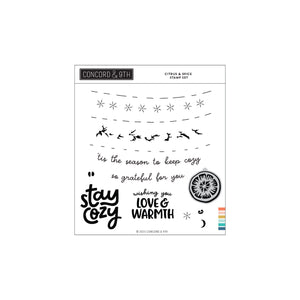 The Citrus & Spice Stamp Set contains several stamps to add detail to the stenciled imagery found in the Citrus & Spice Stencil Pack. The larger, stacked sentiments can be cut out with the coordinating Citrus & Spice Dies. 6" x 6". 14 stamps.