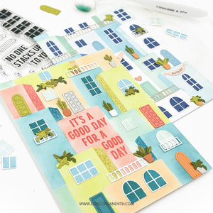 The City Block Stamp Set adds window details as well as sentiments to the vibrant community of buildings created with the coordinating with the City Block Stencil Pack and City Block Dies. 4" x 4". 12 stamps.