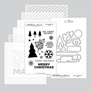 The Simple Christmas Bundle includes the stamp set, coordinating dies, and 6-piece stencil pack—everything you need for festive cardmaking. Create trees, snowflakes, holly, greetings, and bold backgrounds for quick and cheerful holiday projects.